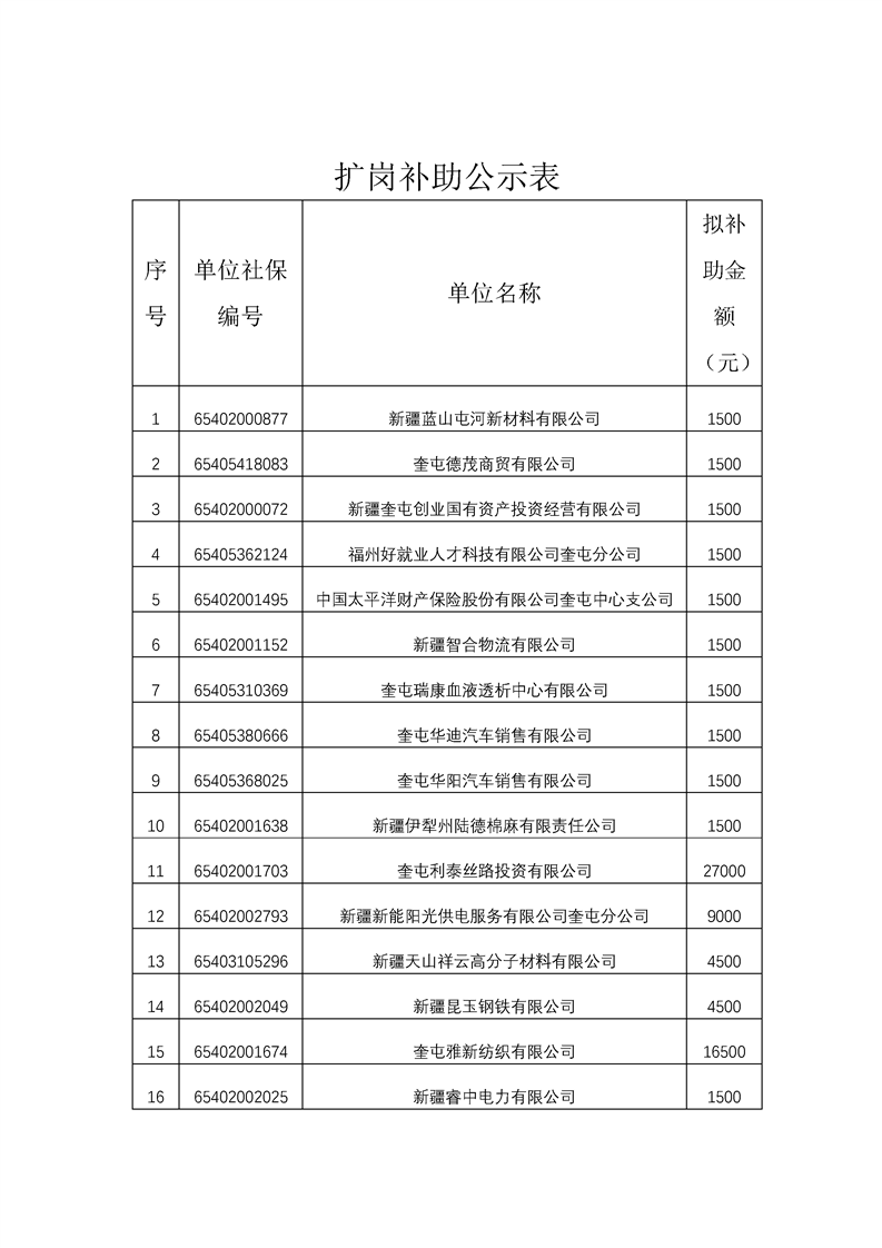 关于拟发放新疆蓝山屯河新材料有限公司等21家单位一次性扩岗补助的公示