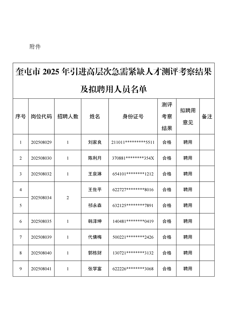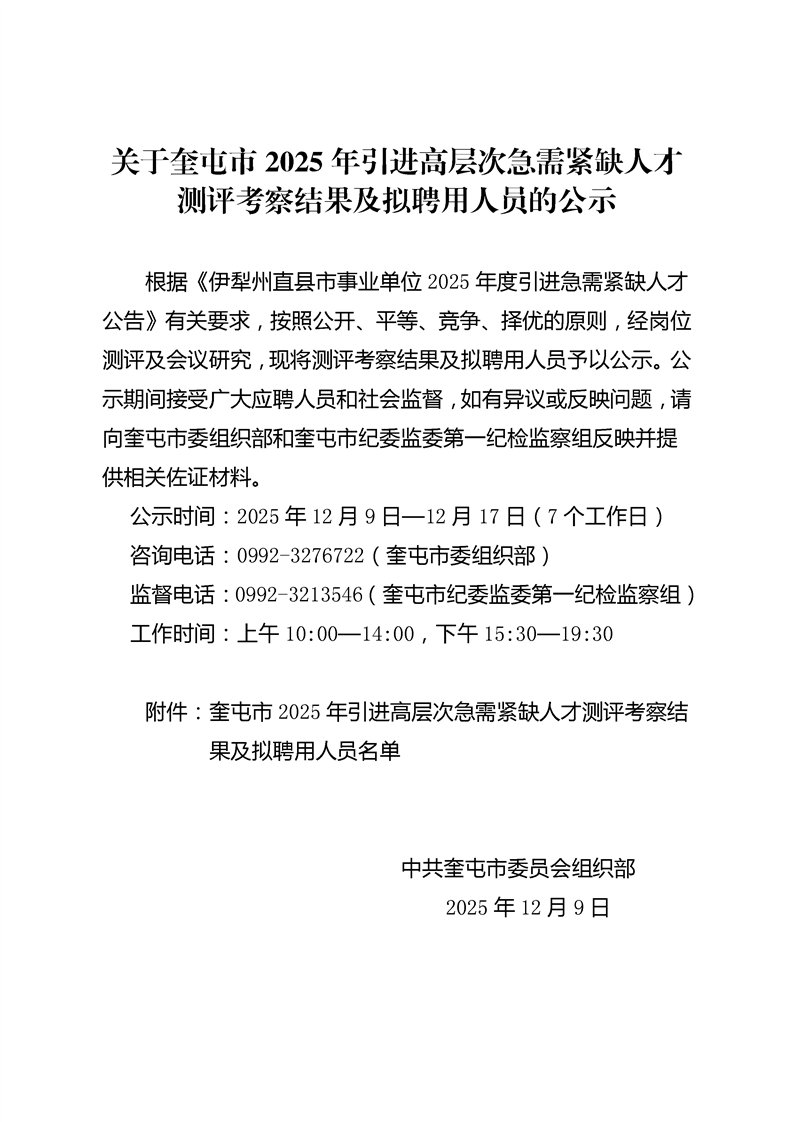 关于奎屯市2025年引进高层次急需紧缺人才测评考察结果及拟聘用人员的公示