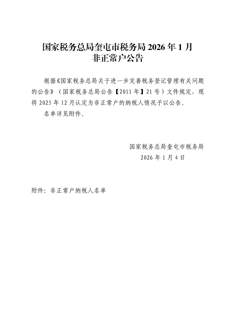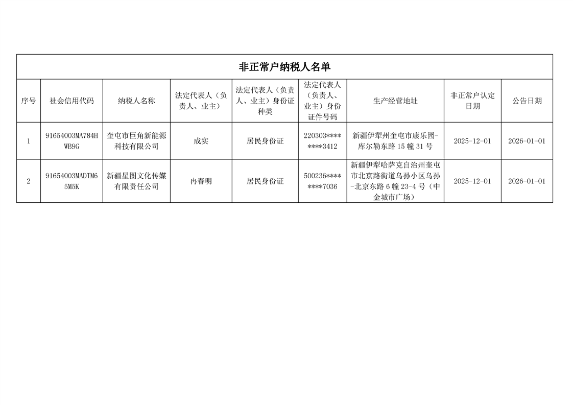 国家税务总局奎屯市税务局2026年1月非正常户公告