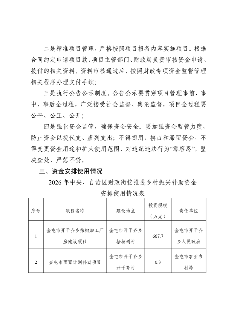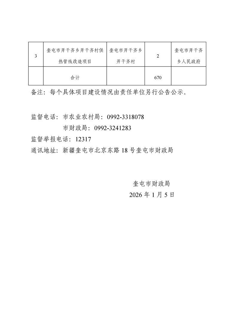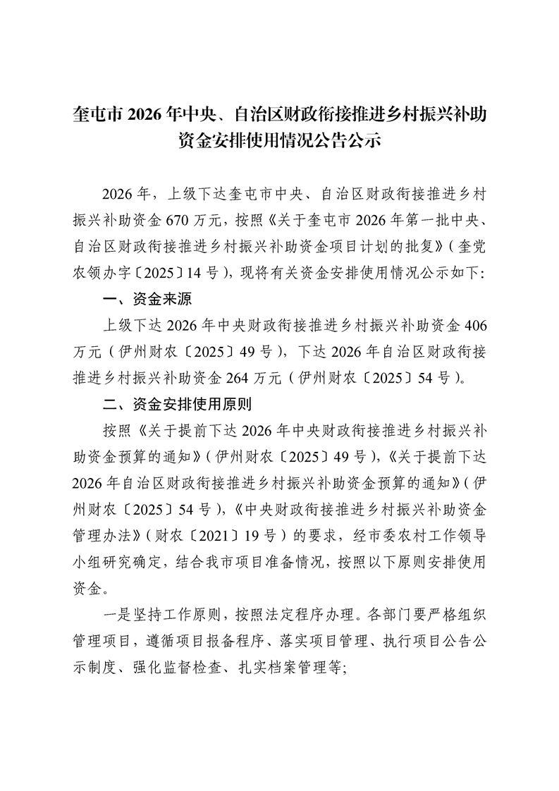奎屯市2026年中央、自治区财政衔接推进乡村振兴补助资金安排使用情况公告公示