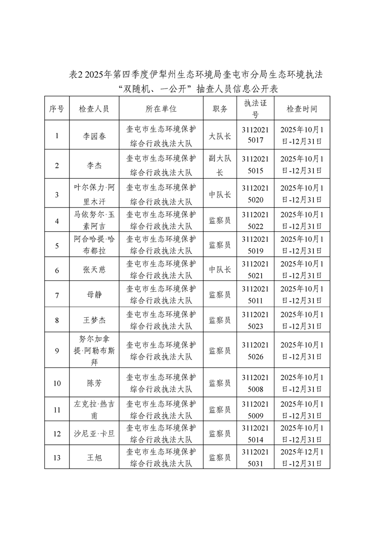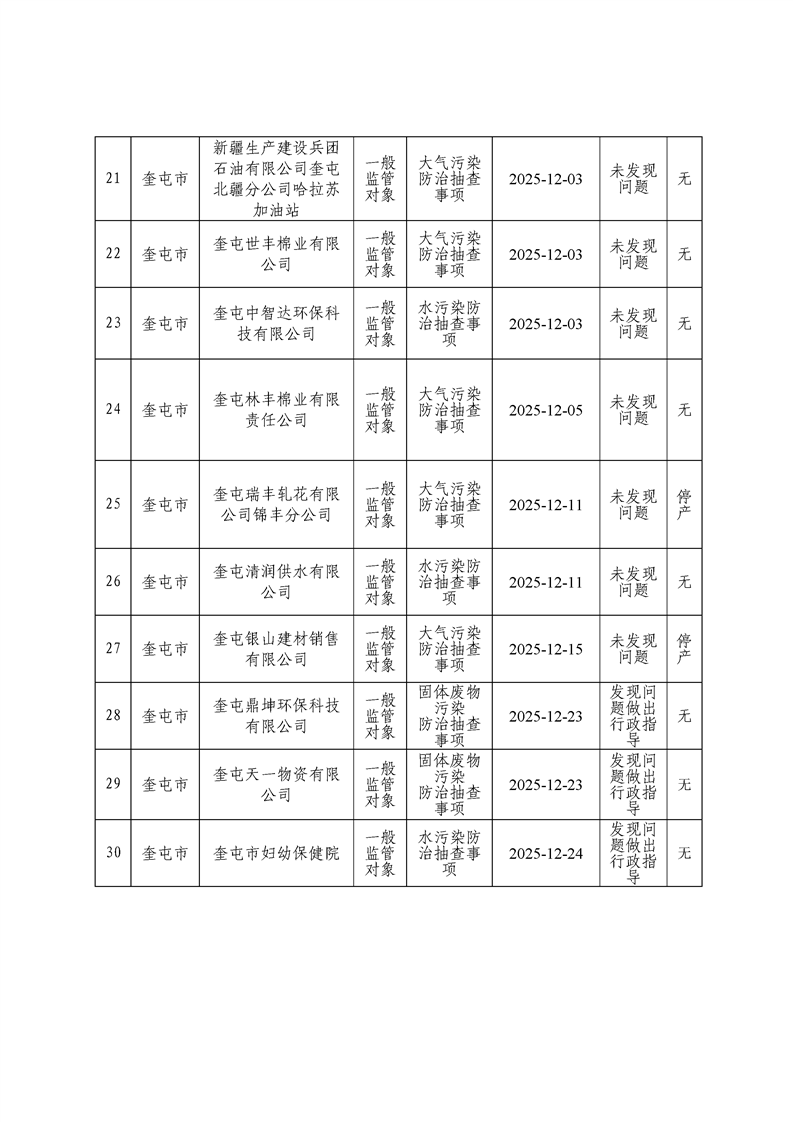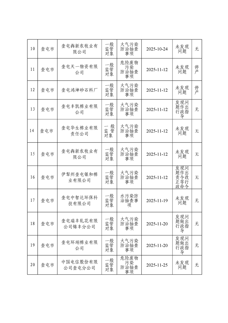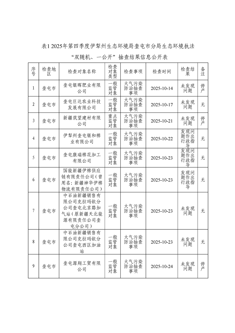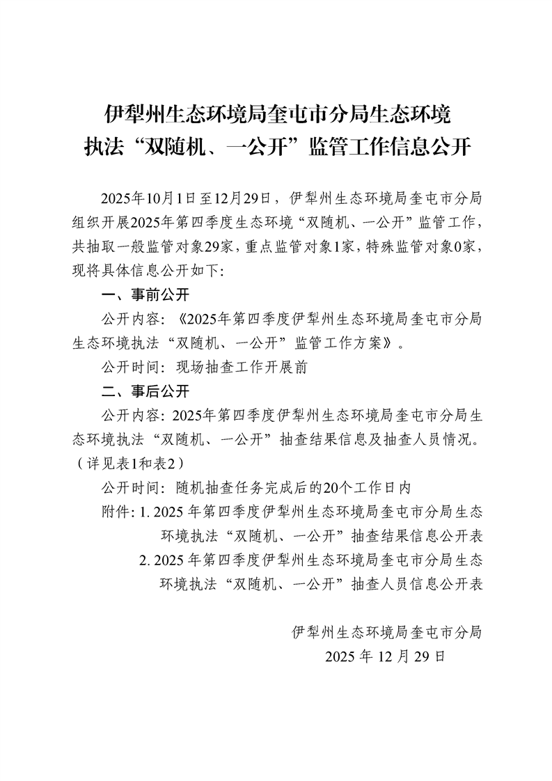 2025年第四季度伊犁州生态环境局奎屯市分局生态环境执法“双随机、一公开”监管工作信息公开
