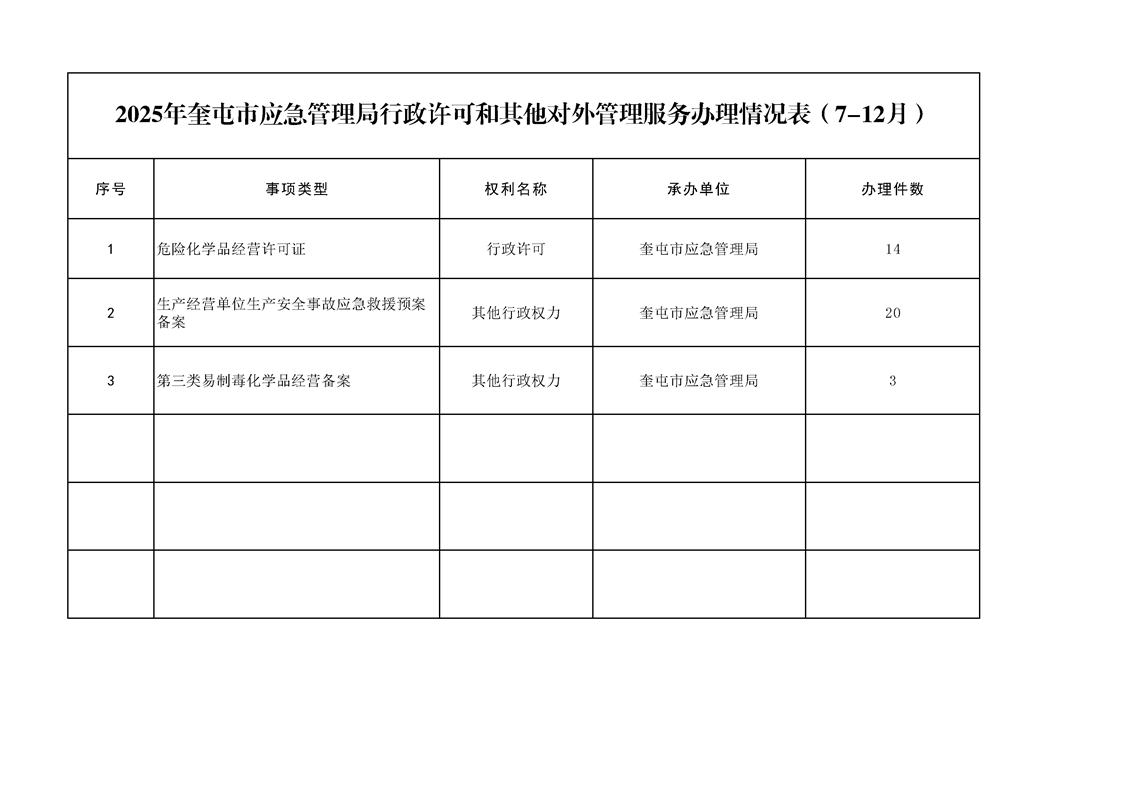 2025年奎屯市应急管理局行政许可和其他对外管理服务办理情况表(7-12月)