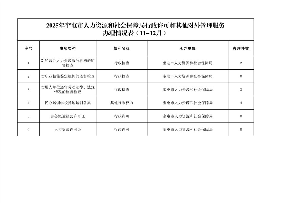 2025年奎屯市人力资源和社会保障局行政许可和其他对外管理服务办理情况表(11-12月)