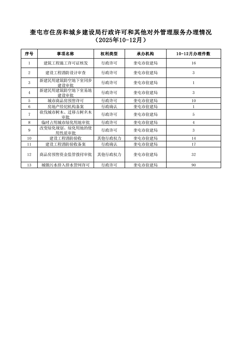 奎屯市住房和城乡建设局行政许可和其他对外管理服务办理情况(2025年10-12月)