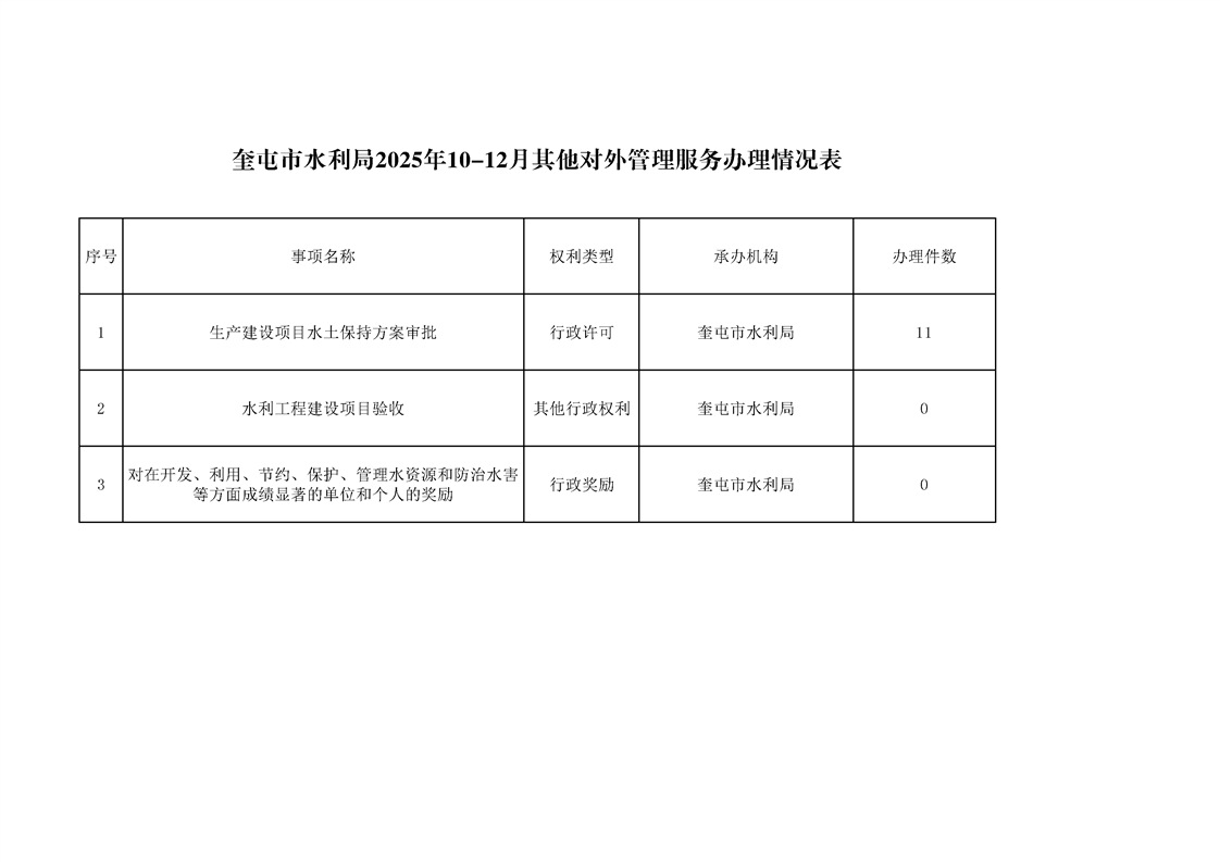 奎屯市水利局2025年10-12月其他对外管理服务办理情况表