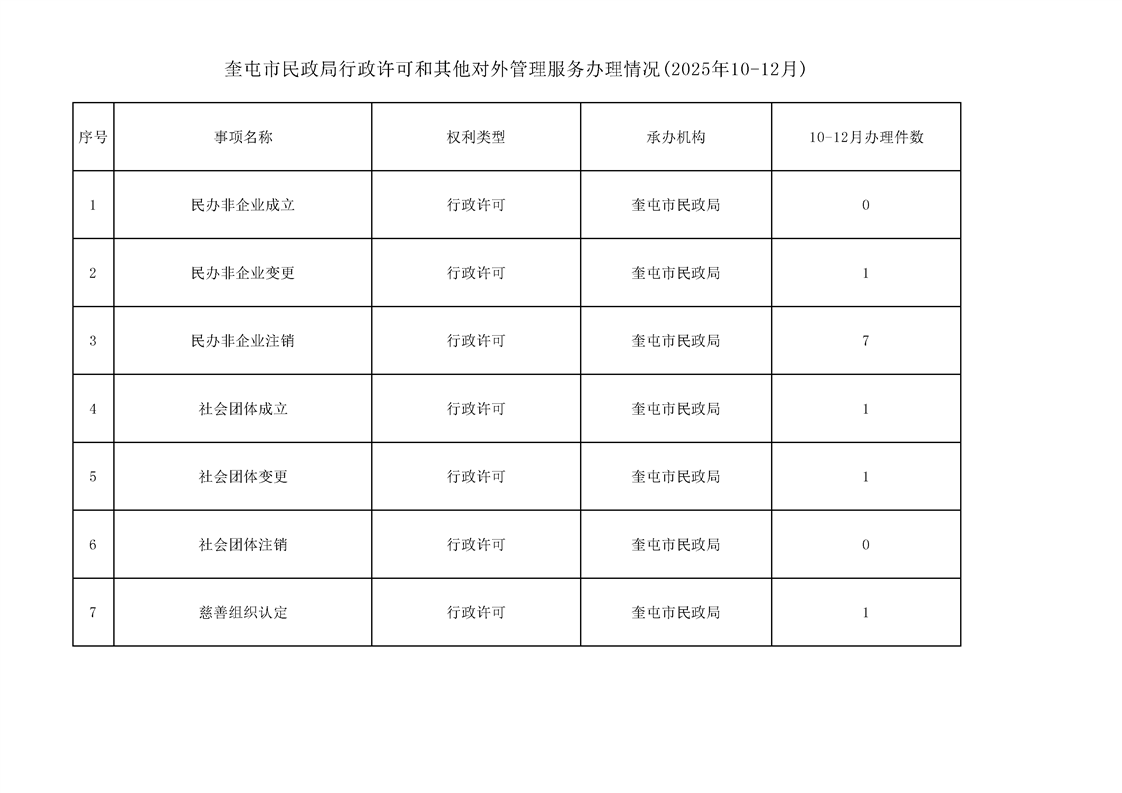 奎屯市民政局行政许可和其他对外管理服务办理情况(2025年10-12月)