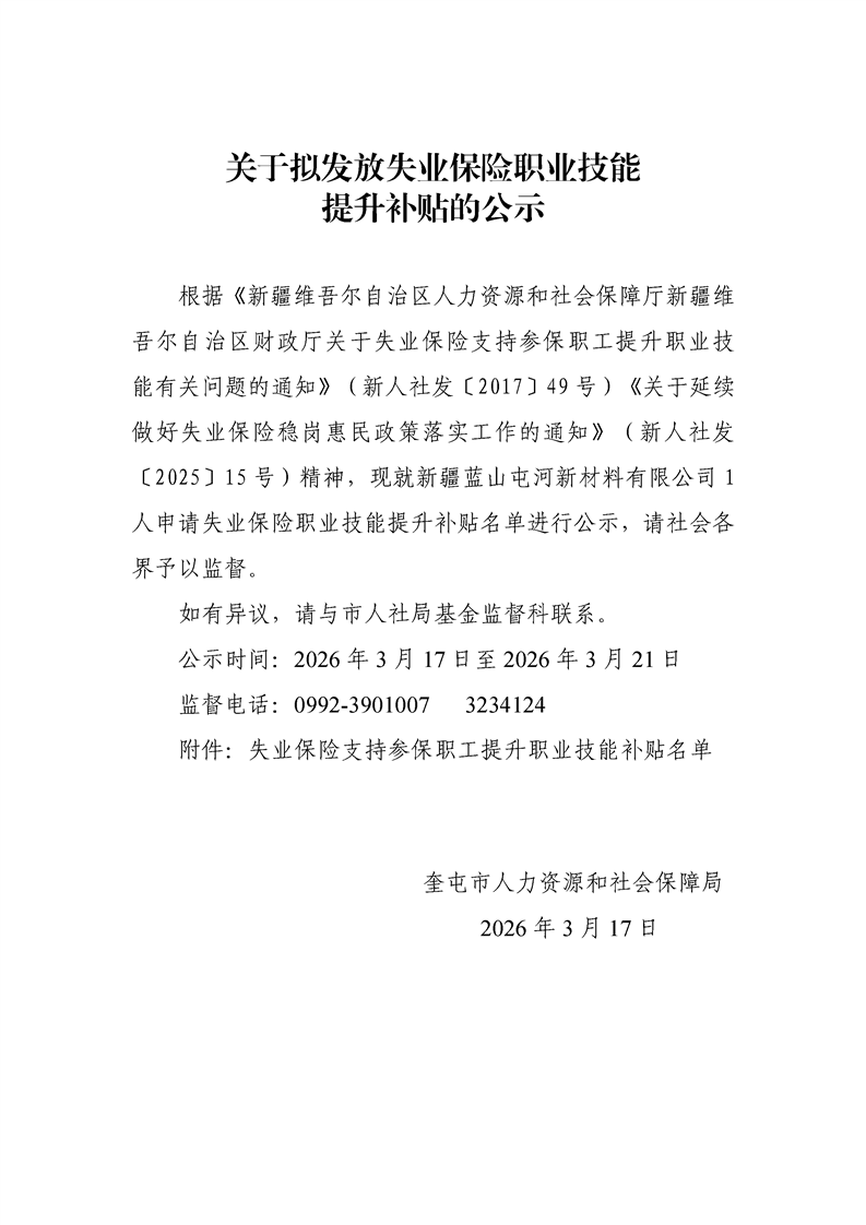 关于拟发放失业保险职业技能提升补贴的公示