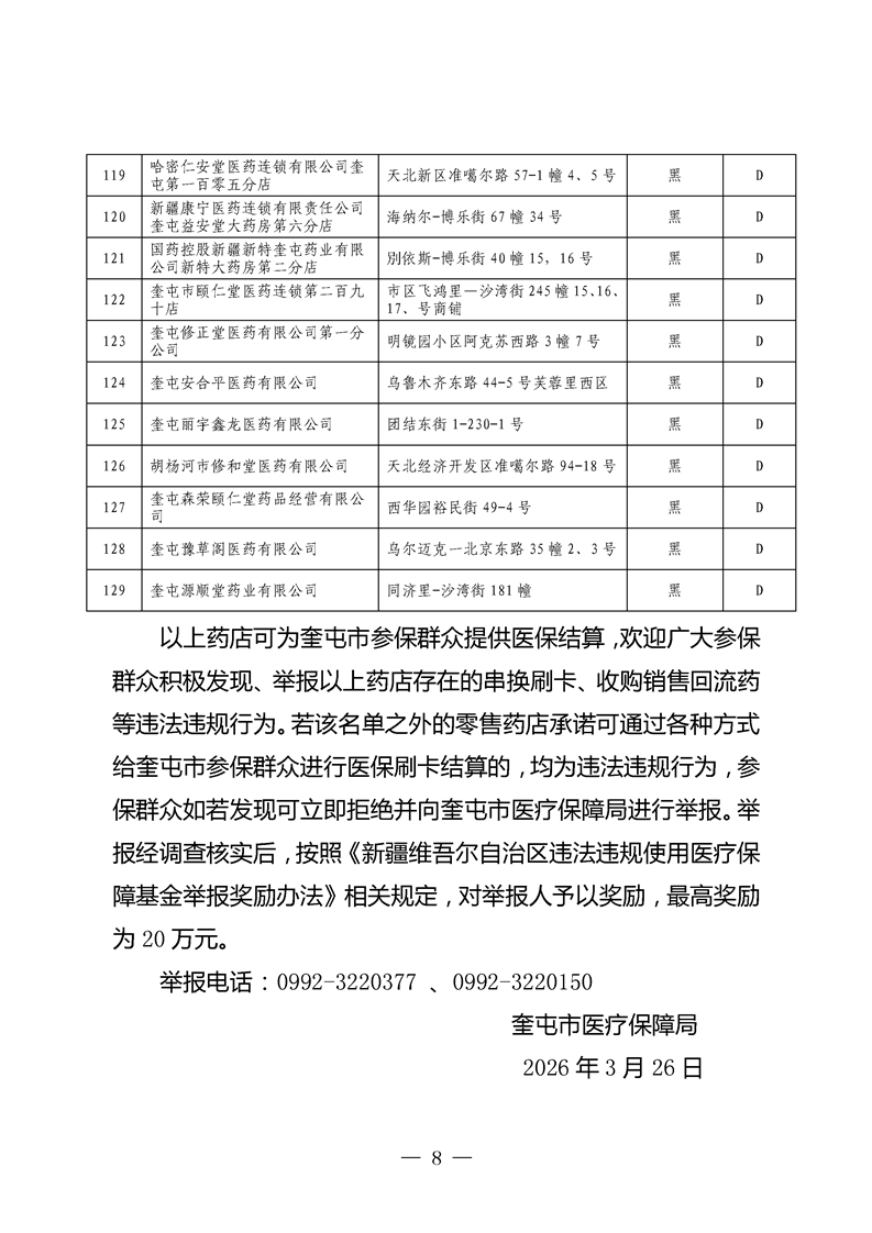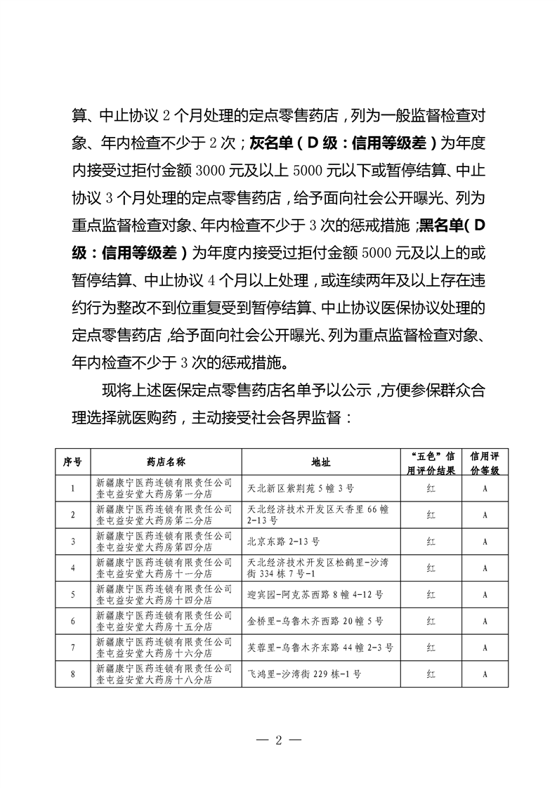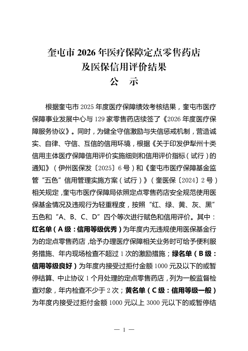 奎屯市2026年医疗保障定点零售药店及医保信用评价结果公示