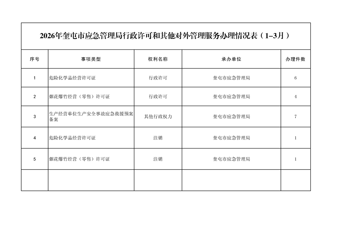 2026年奎屯市应急管理局行政许可和其他对外管理服务办理情况表(1-3月)