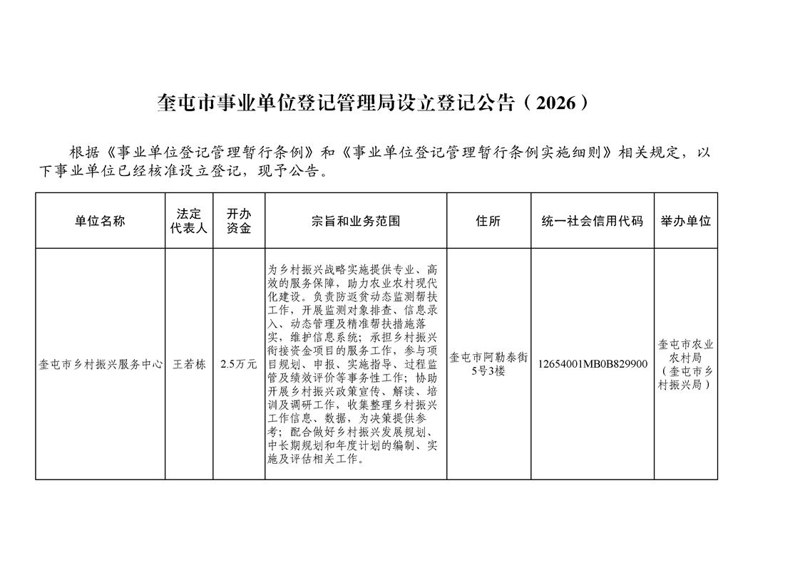 奎屯市事业单位登记管理局设立登记公告(2026)