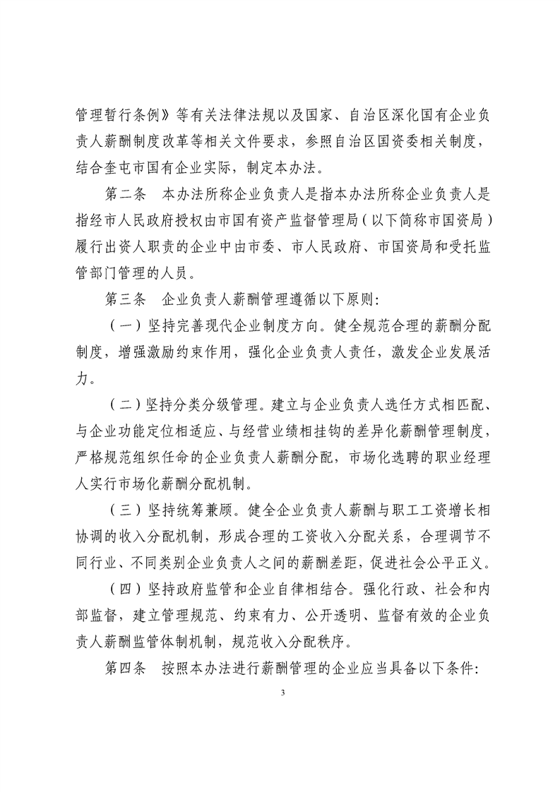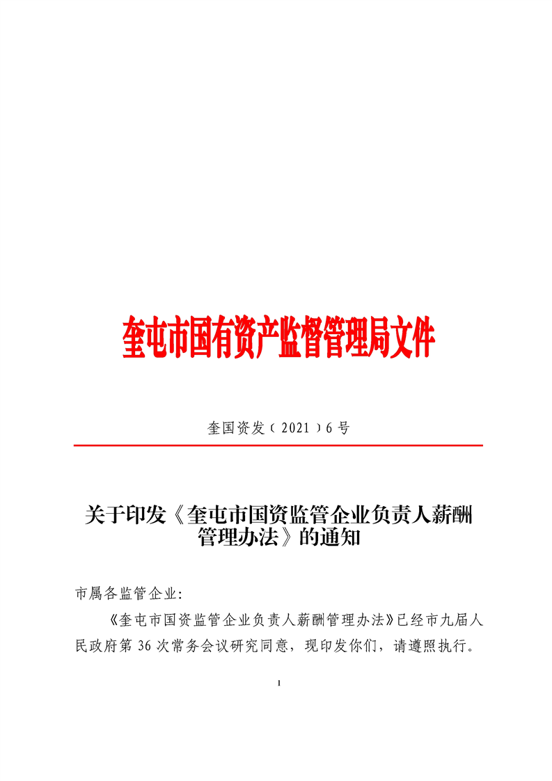 关于印发《奎屯市国资监管企业负责人薪酬管理办法》的通知 (奎国资发﹝2021﹞6号)