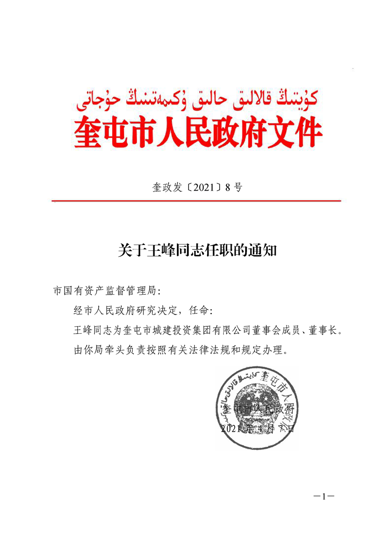 关于王峰同志任职的通知 奎政发〔2021〕8号