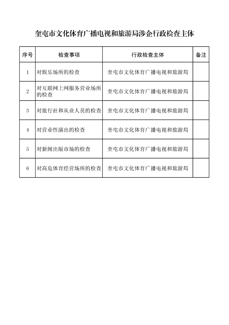 奎屯市文化体育广播电视和旅游局涉企行政检查主体