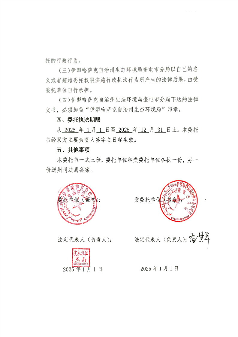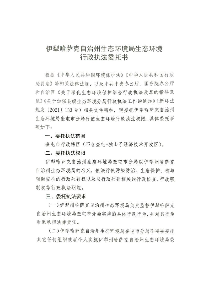 伊犁哈萨克自治州生态环境局生态环境行政执法委托书
