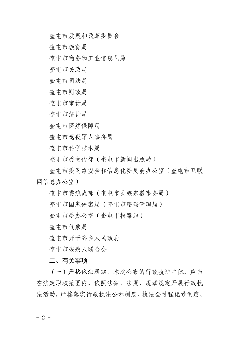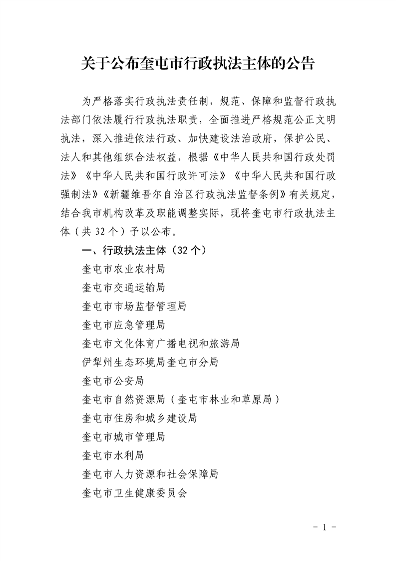 关于公布奎屯市行政执法主体的公告