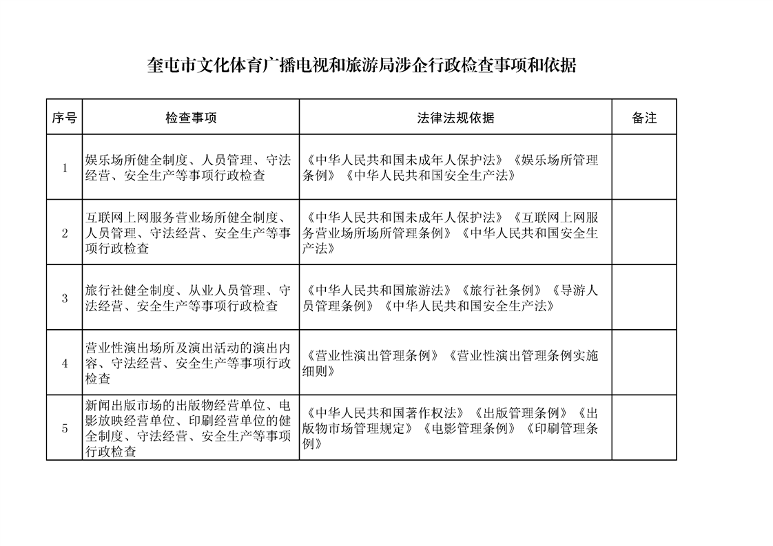 奎屯市文化体育广播电视和旅游局涉企行政检查事项和依据