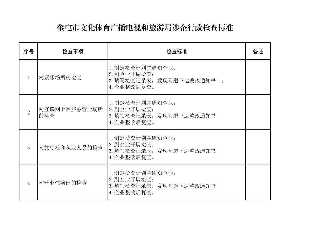 奎屯市文化体育广播电视和旅游局涉企行政检查标准
