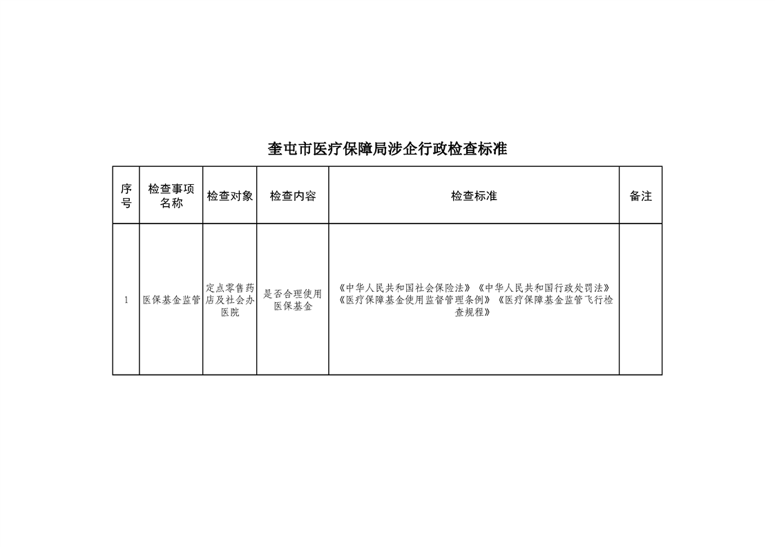 奎屯市医疗保障局涉企行政检查标准