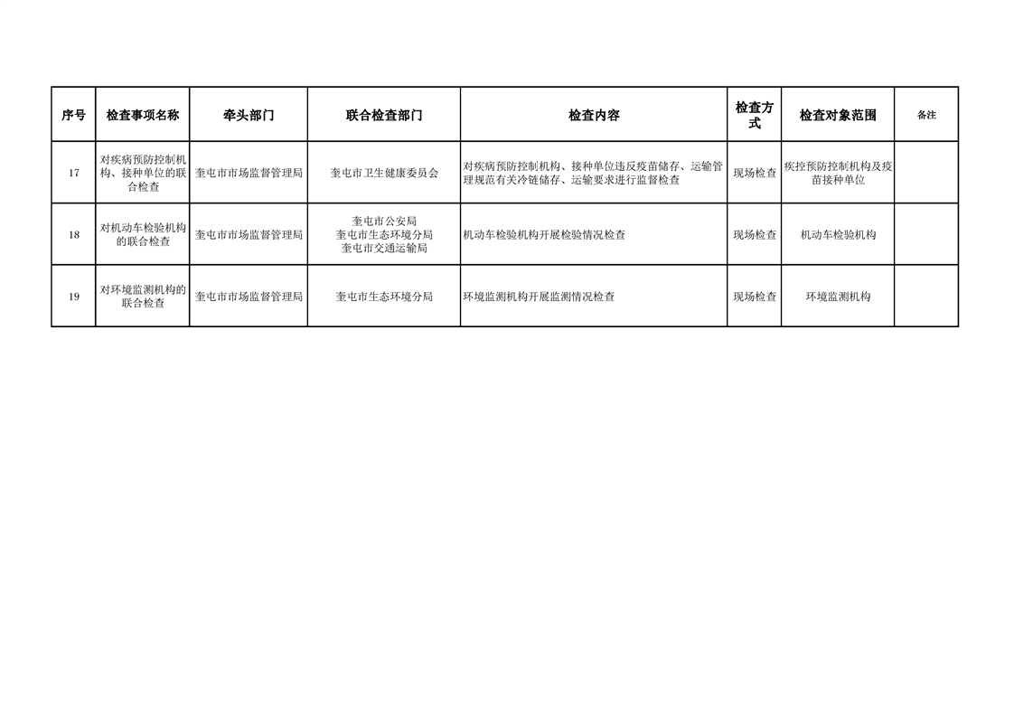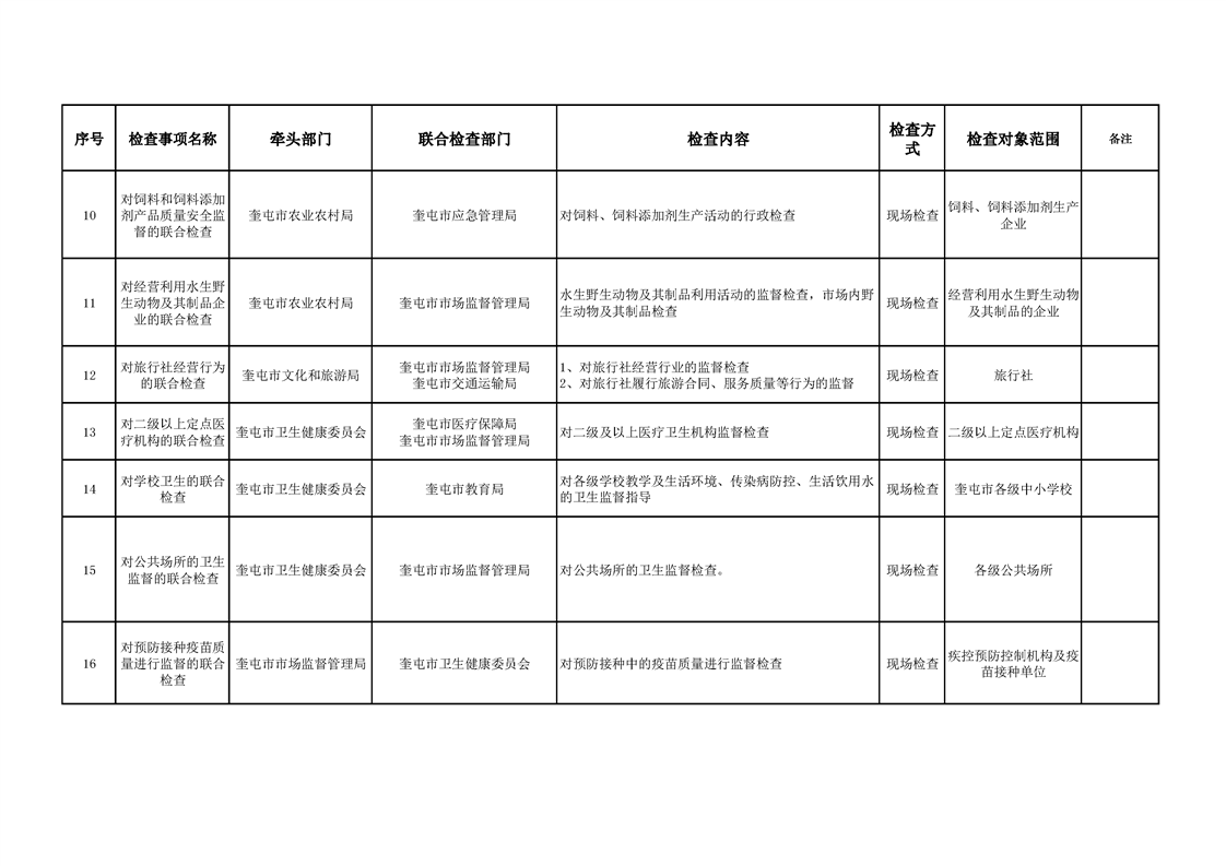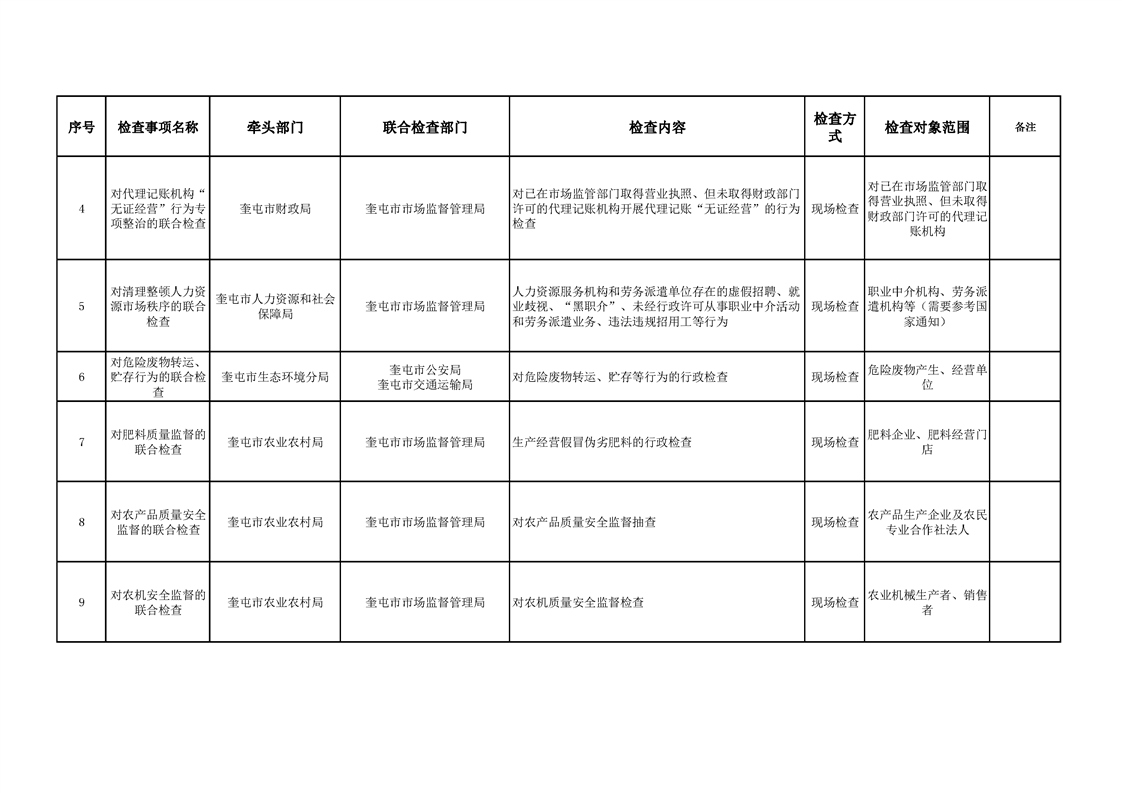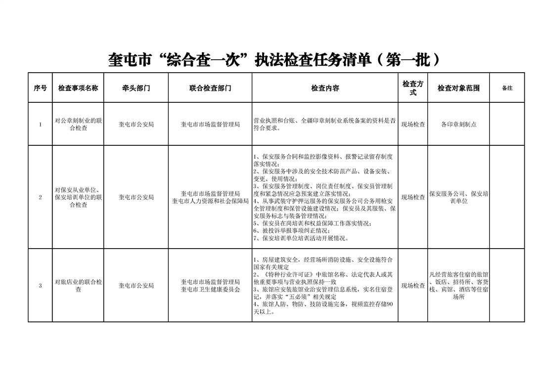 奎屯市“综合查一次”执法检查任务清单(第一批)