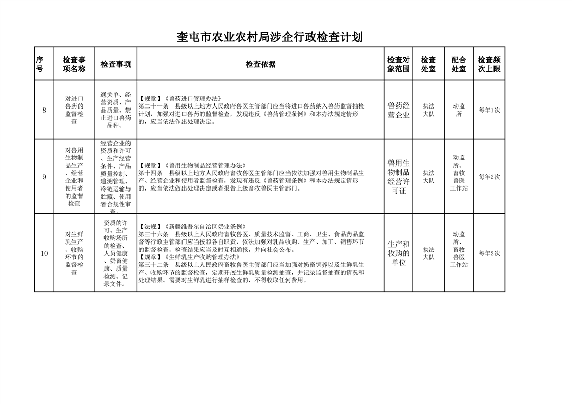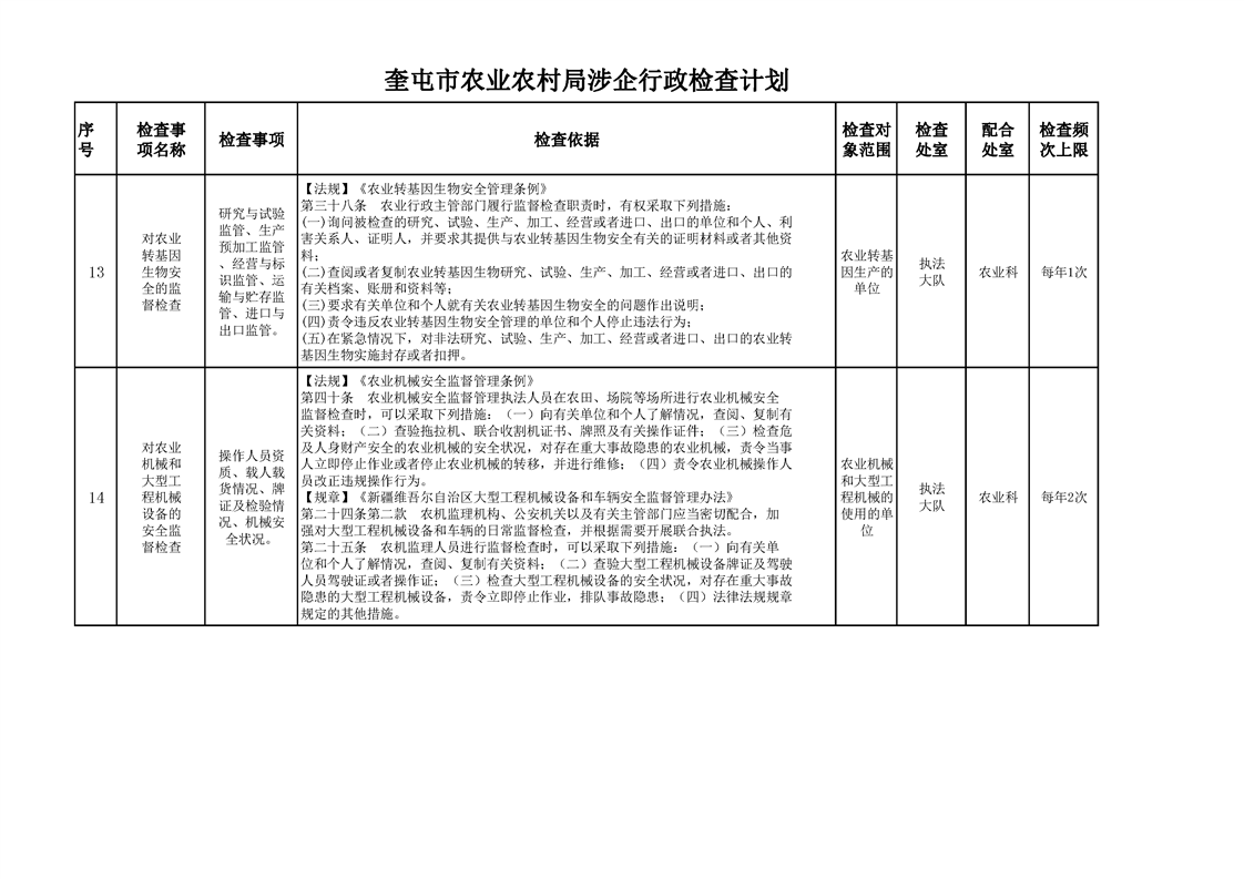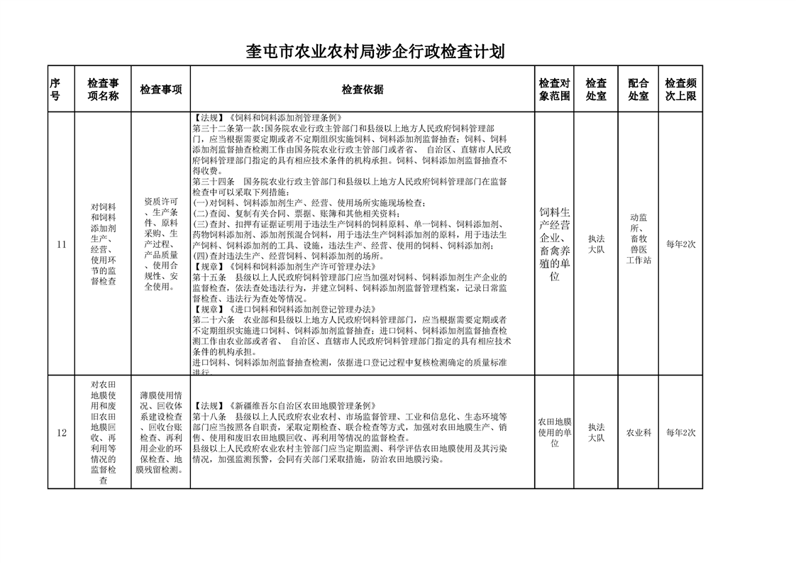 奎屯市农业农村局涉企行政检查计划