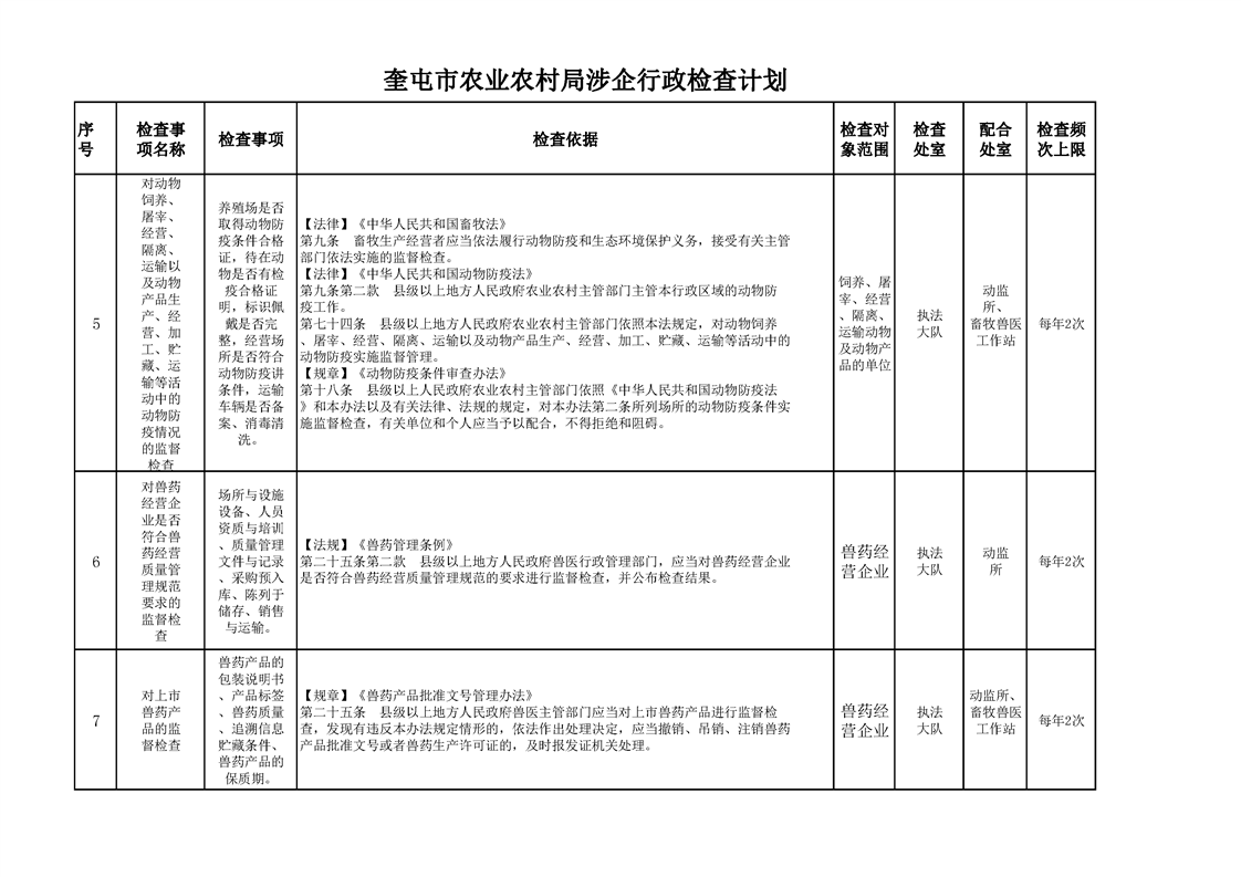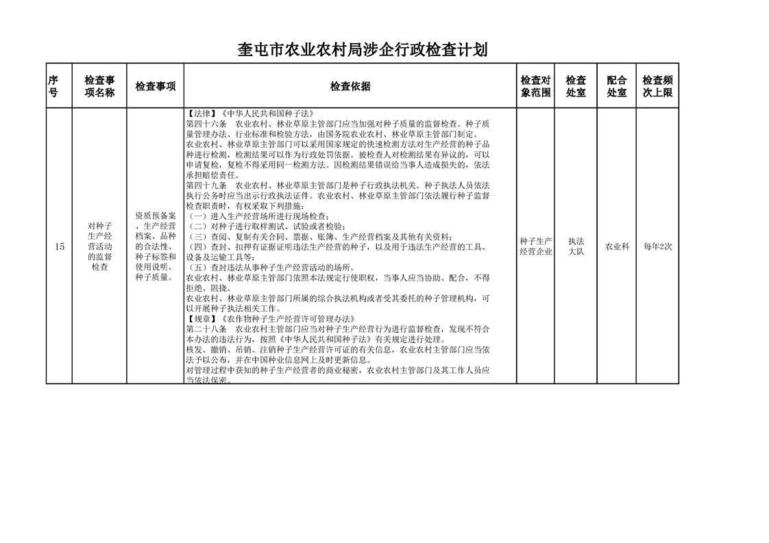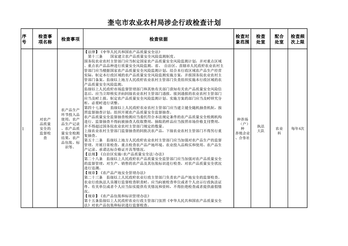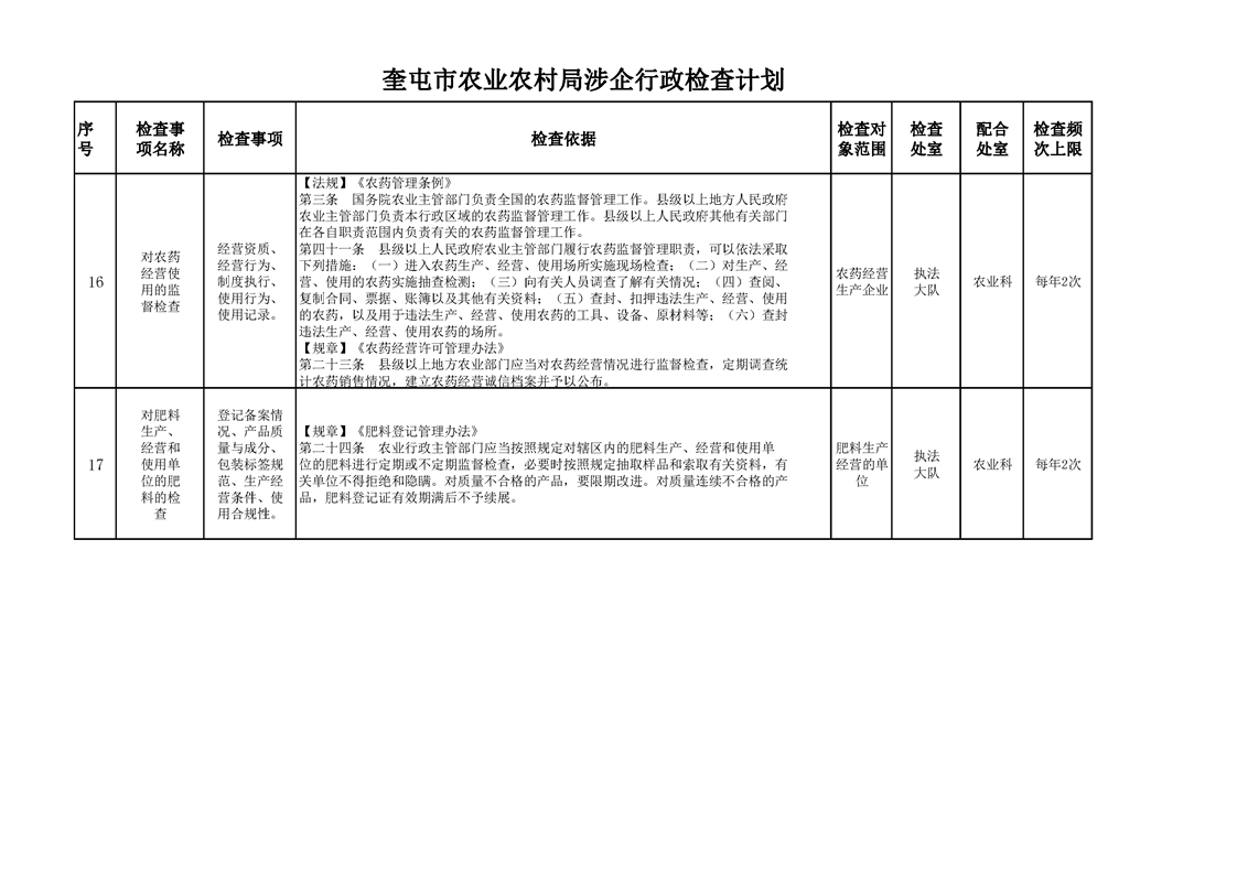 奎屯市农业农村局涉企行政检查计划