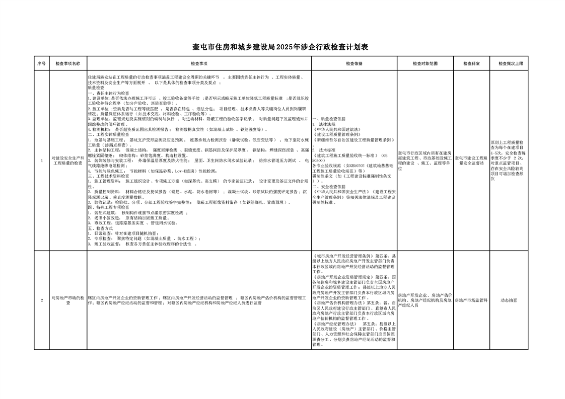 奎屯市住房和城乡建设局涉企行政检查计划表