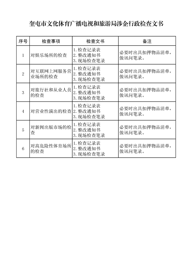奎屯市文化体育广播电视和旅游局涉企行政检查文书