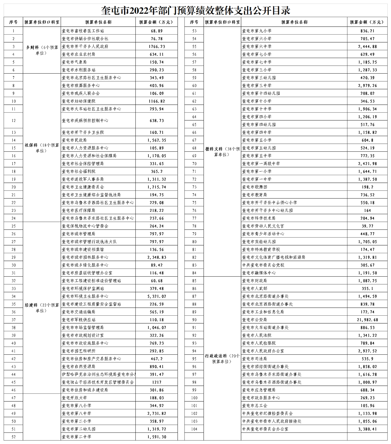 奎屯市2022年部门预算绩效整体公开目录