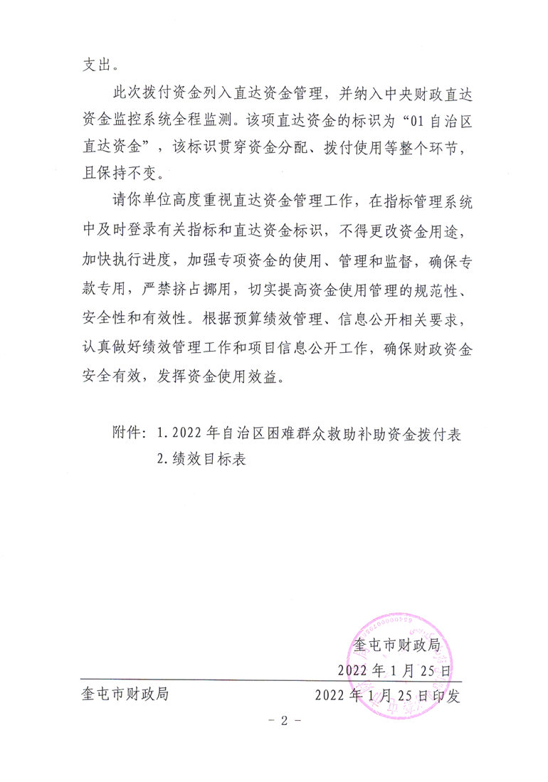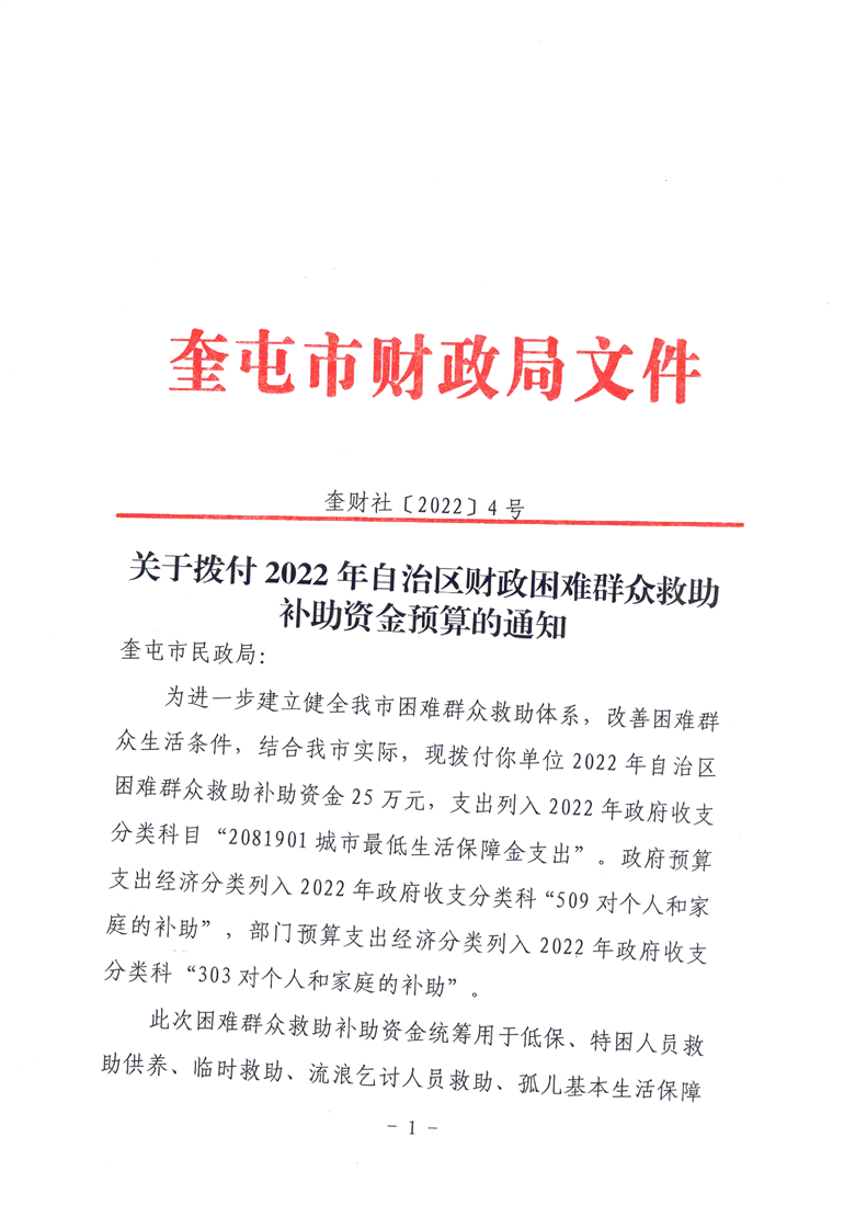 关于拨付2022年自治区财政困难群众救助补助资金预算的通知 (奎财社【2022】4号)