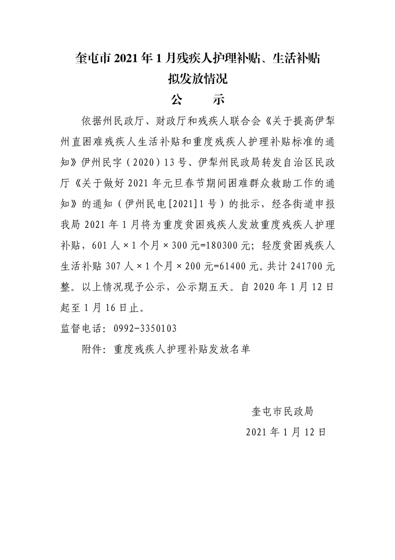 奎屯市2021年1月残疾人护理补贴、生活补贴拟发放情况公示