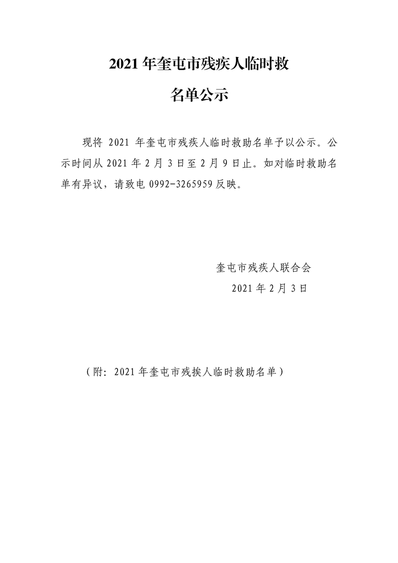 2021年奎屯市残疾人临时救助名单公示