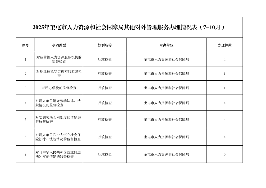 2025年奎屯市人力资源和社会保障局其他对外管理服务办理情况表(7-10月)