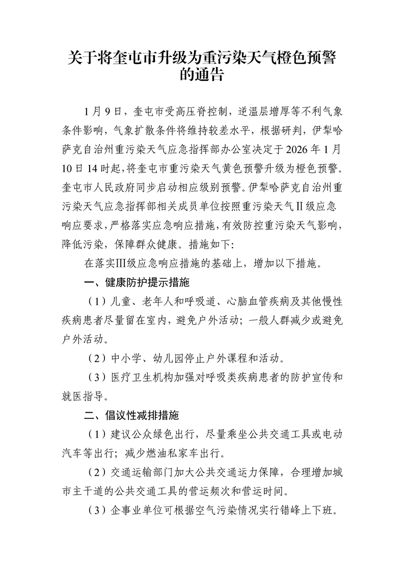 关于将奎屯市升级为重污染天气橙色预警的通告