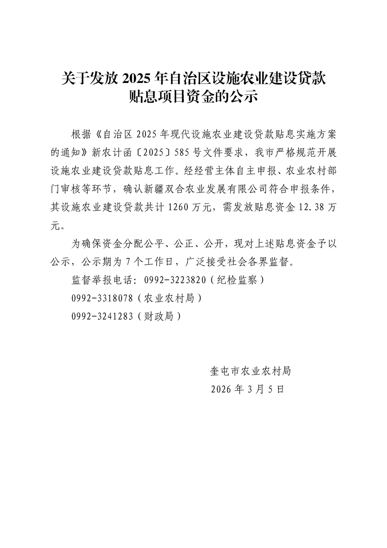 关于发放2025年自治区设施农业建设贷款贴息项目资金的公示