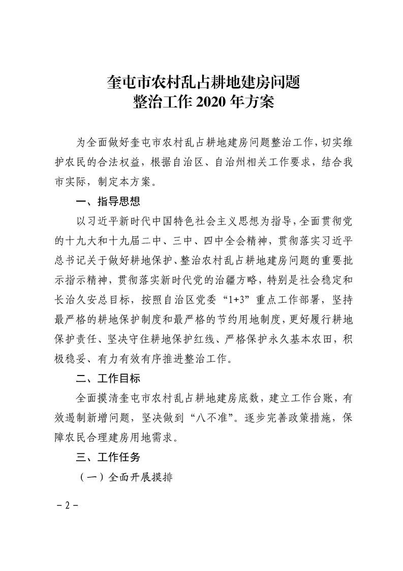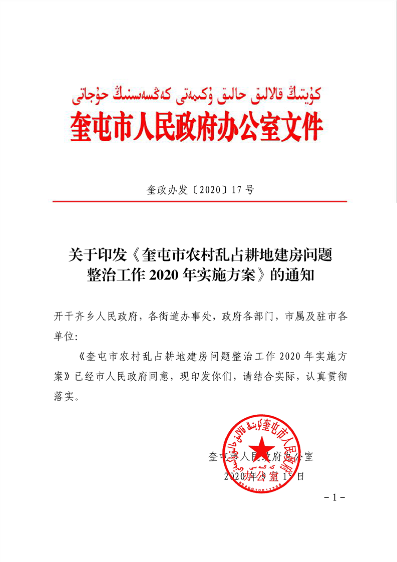 关于印发《奎屯市农村乱占耕地建房问题整治工作 2020 年实施方案》的通知(奎政办发〔2020〕17 号)