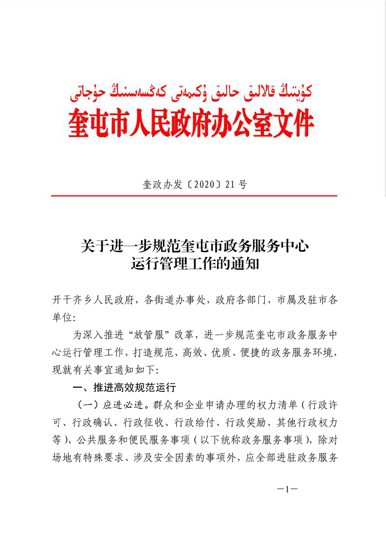 关于进一步规范奎屯市政务服务中心运行管理工作的通知(奎政办发〔2020〕21 号)