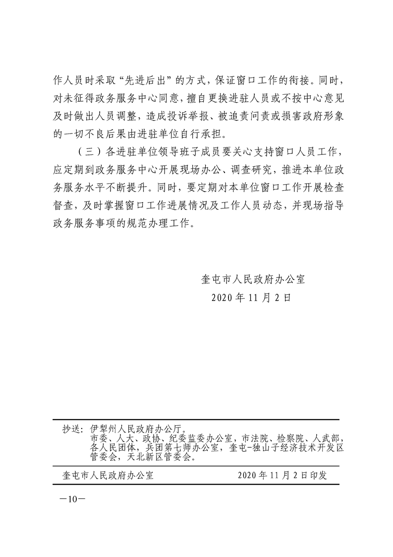 关于进一步规范奎屯市政务服务中心运行管理工作的通知(奎政办发〔2020〕21 号)