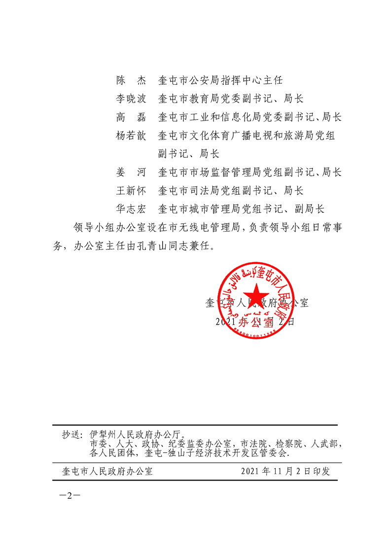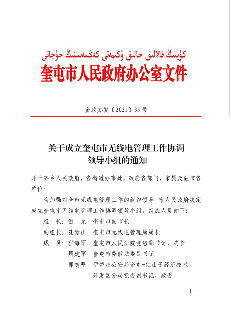 关于成立奎屯市无线电管理工作协调领导小组的通知 奎政办发〔2021〕35号
