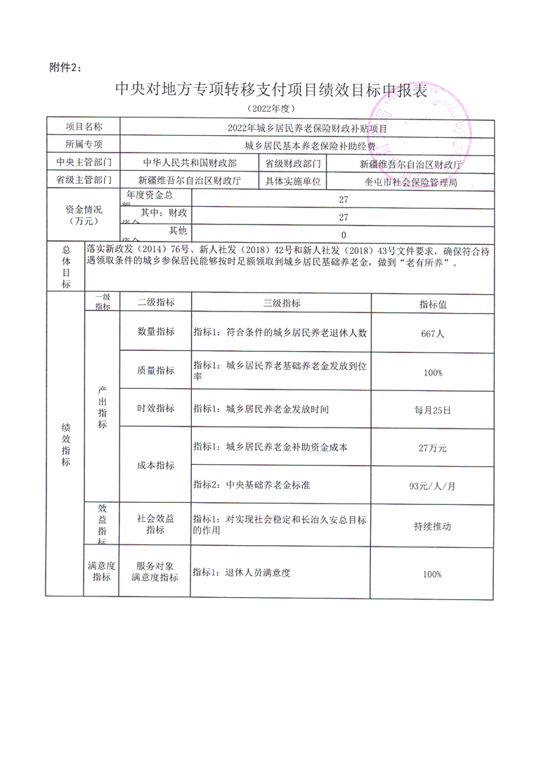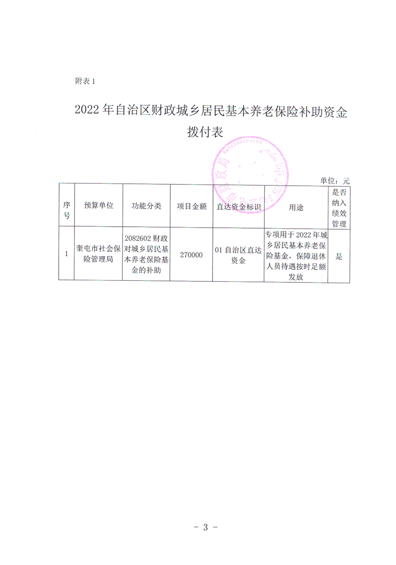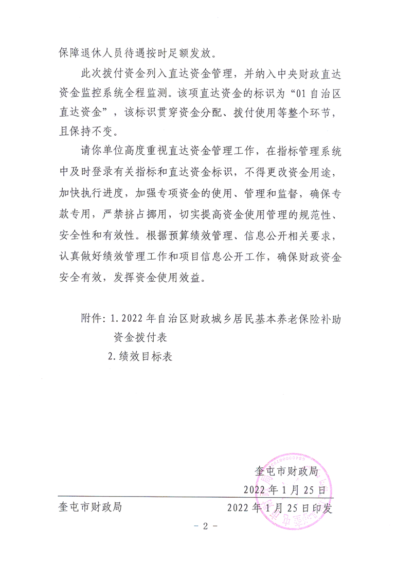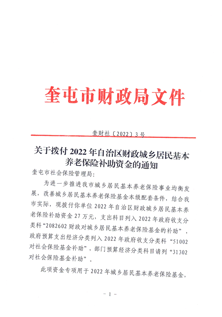 关于拨付2022年自治区财政城乡居民养老保险补助资金的通知(奎财社【2022】3号)