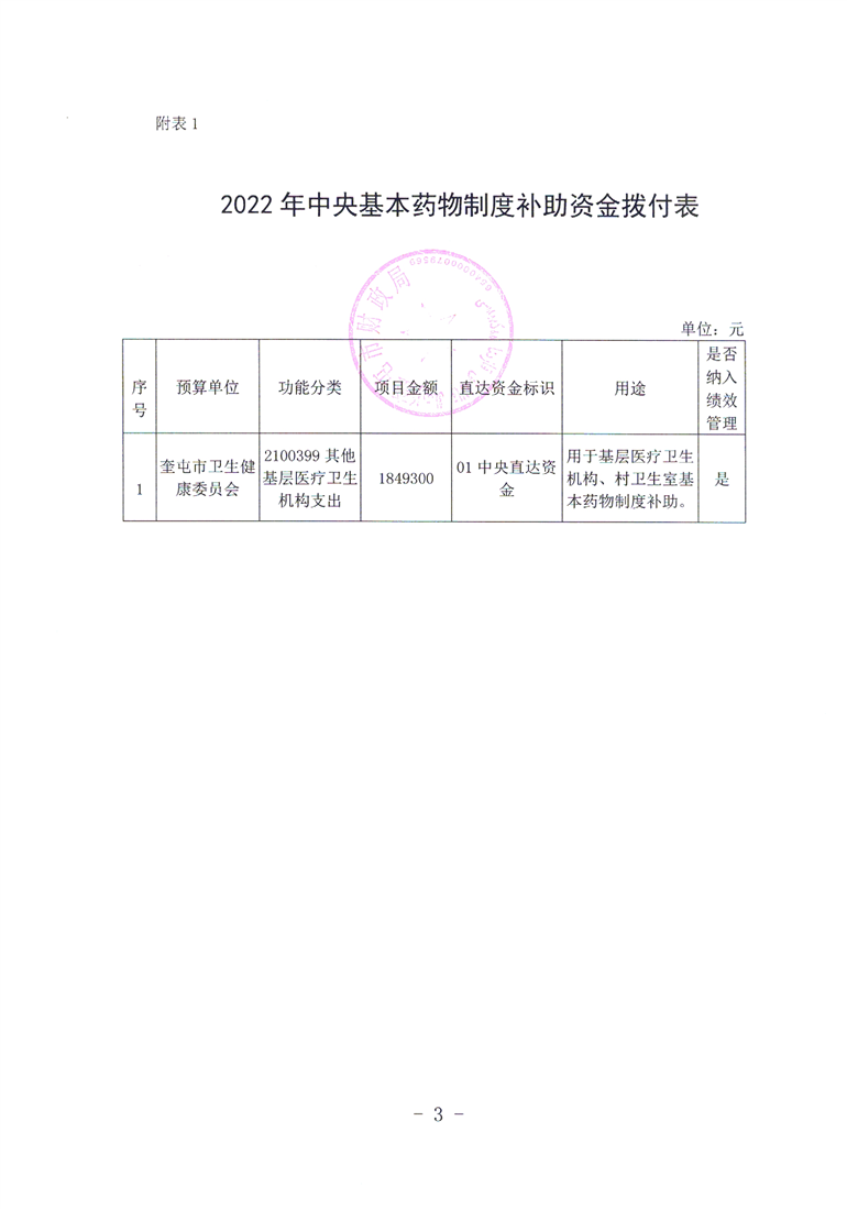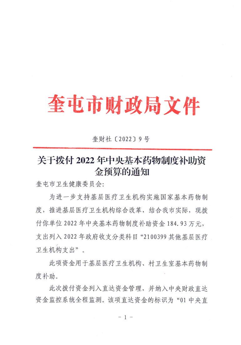 关于拨付2022年中央基本药物制度补助资金预算的通知(奎财社【2022】9号)