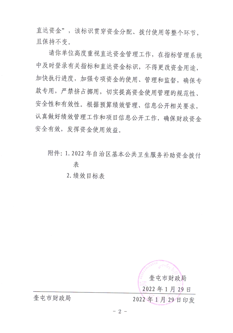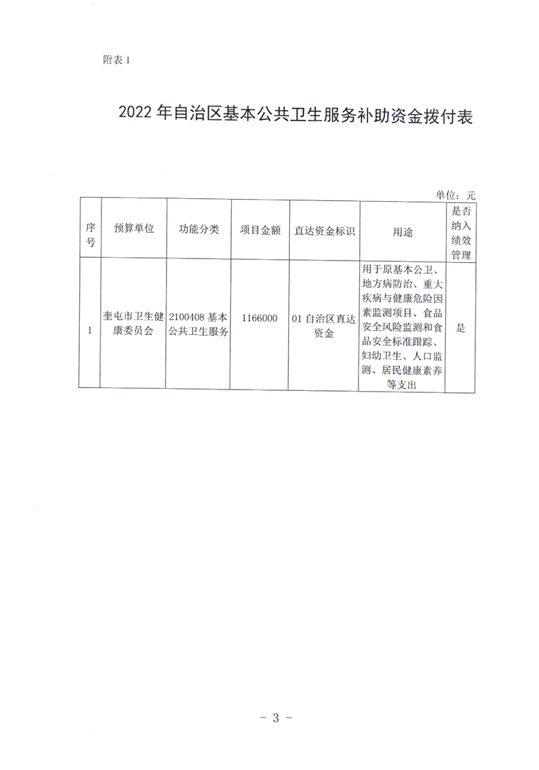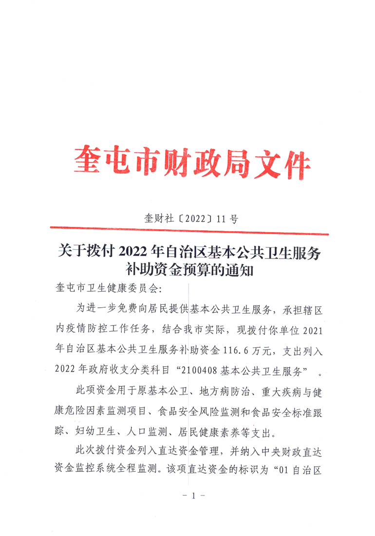 关于拨付2022年自治区基本公共卫生服务补助资金预算的通知 (奎财社【2022】11号)