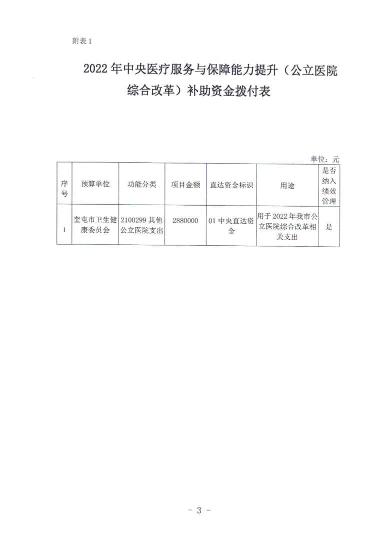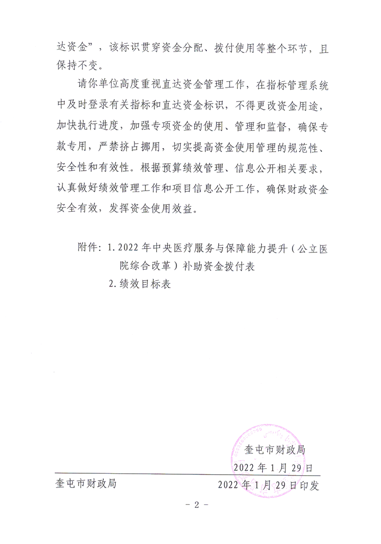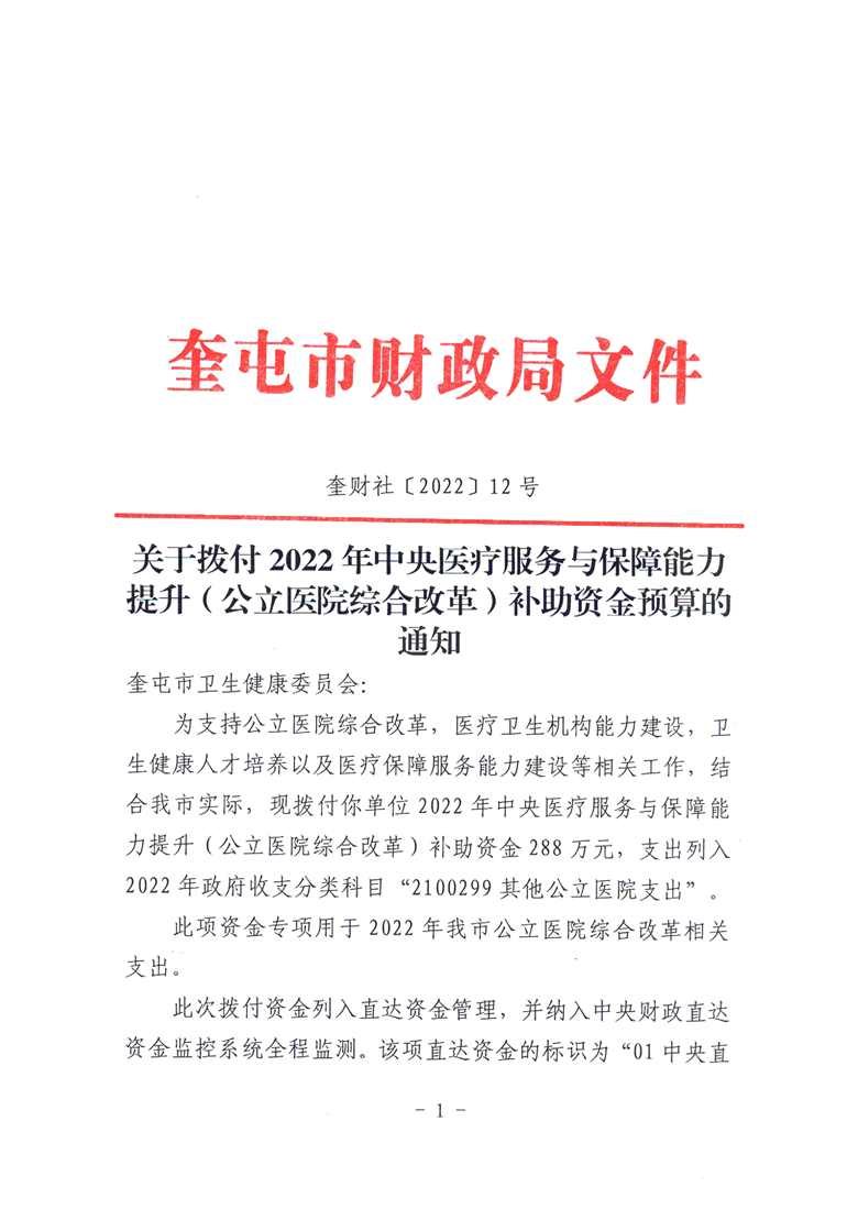 关于拨付2022年中央医疗服务与保障能力提升(公立医院综合改革) 补助资金预算的通知 奎财社【2022】12号