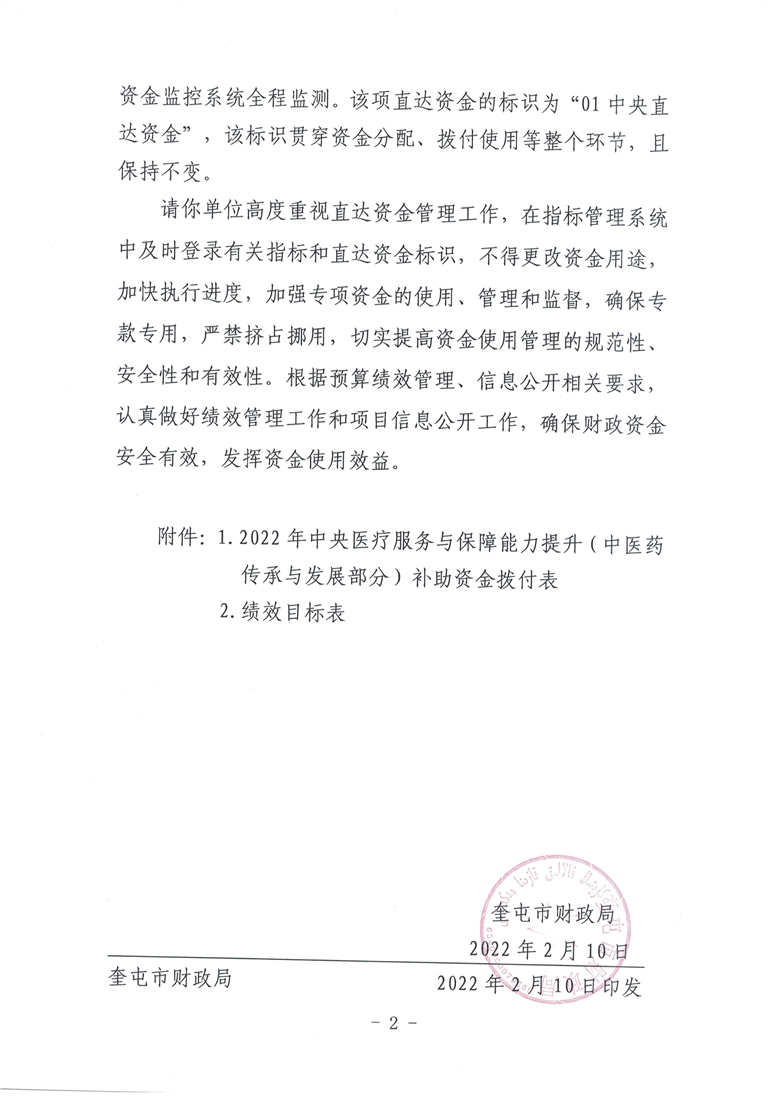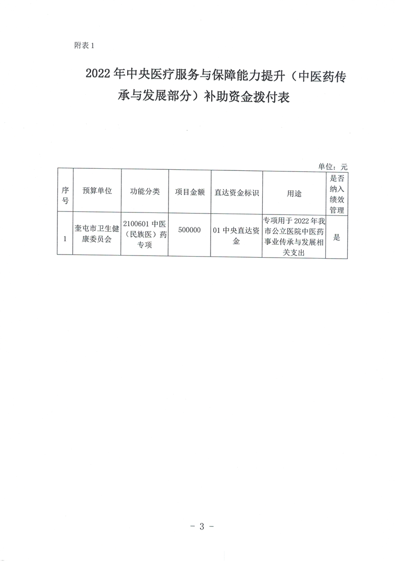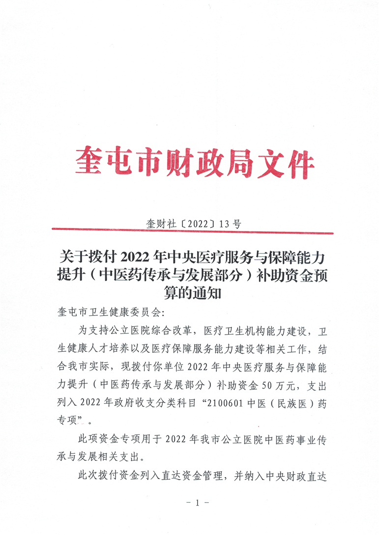 关于拨付2022年中央医疗服务与保障能力提升(中医药传承与发展部分)补助资金预算的通知 奎财社【2022】13号