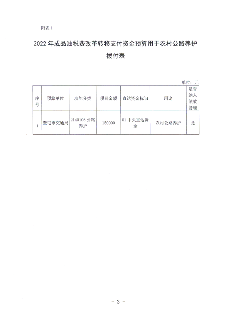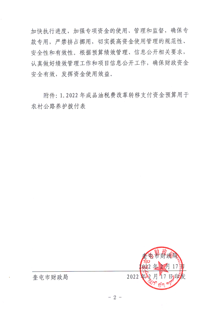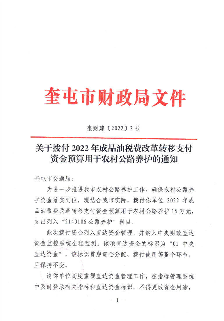 关于拨付2022年成品油税费改革转移支付资金用于农村公路养护的通知奎财建[2022]2号