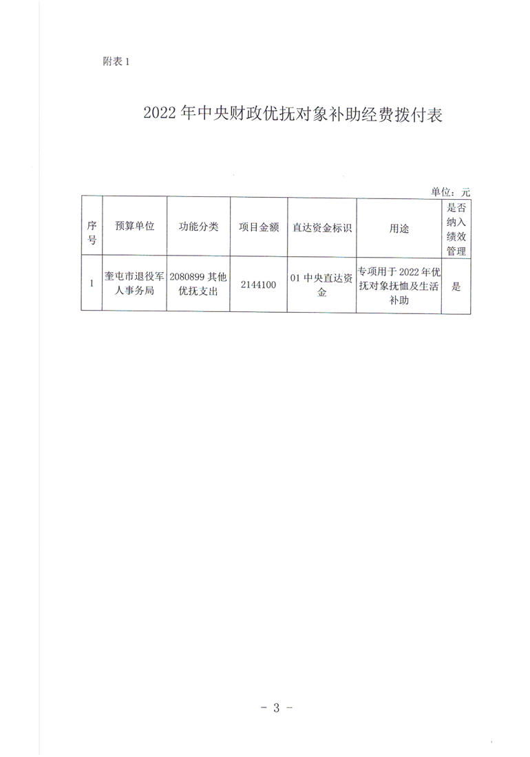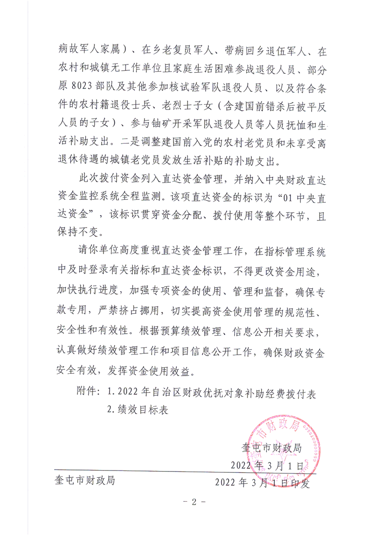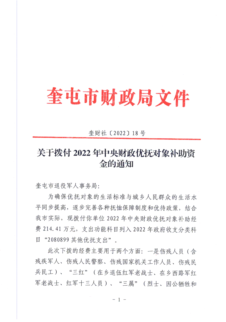 关于拨付2022年中央财政优抚对象补助资金的通知 (奎财社【2022】18号)