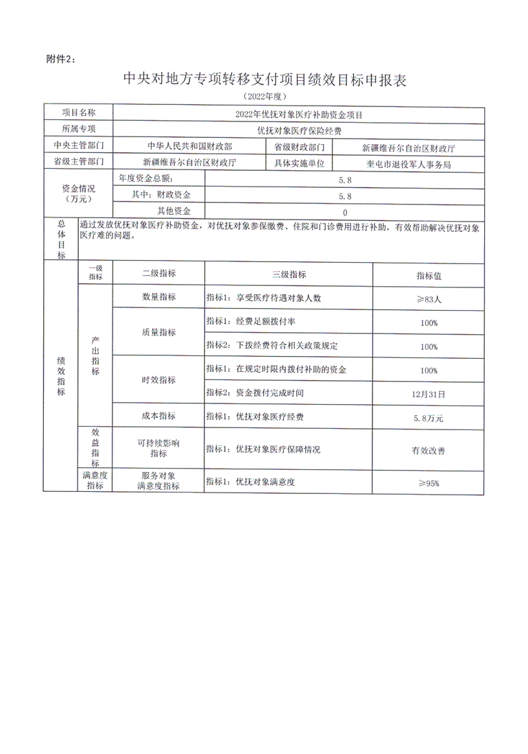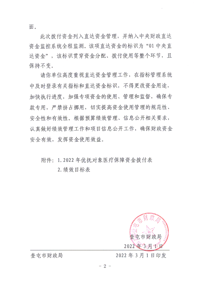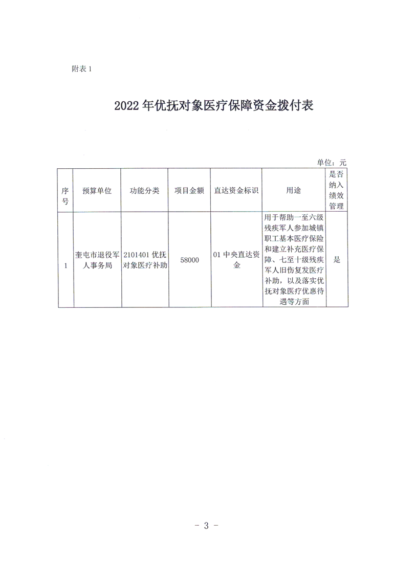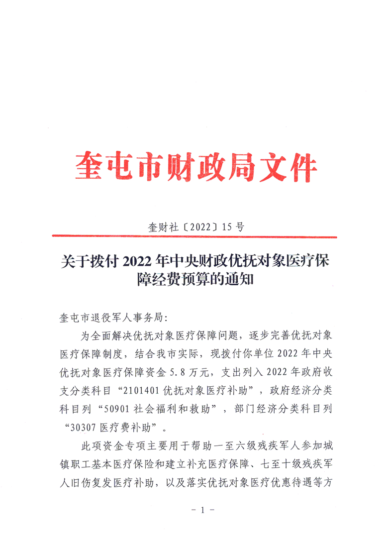 关于拨付2022年中央财政优抚对象医疗保障经费预算的通知 (奎财社【2022】15号)