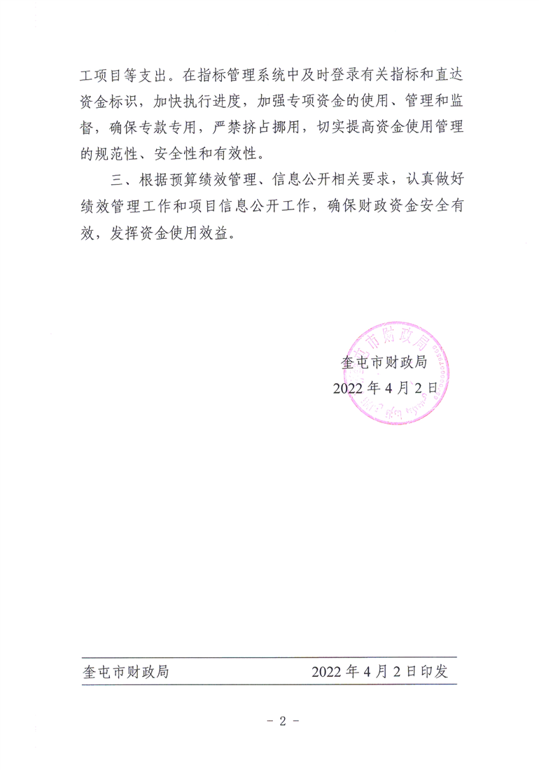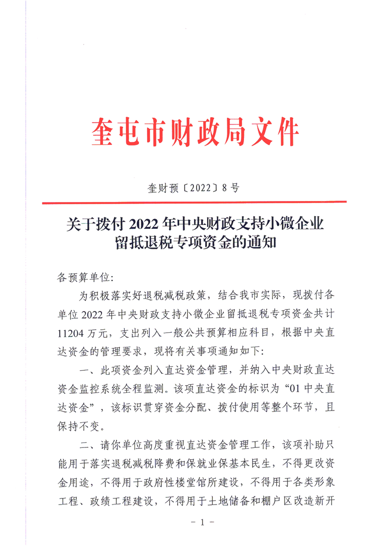 关于拨付2022年中央财政支持小微企业留抵退税专项资金的通知(奎财预〔2022〕8号)