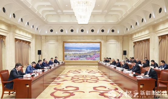 4月3日,自治区党委书记陈小江、自治区主席艾尔肯·吐尼亚孜在乌鲁木齐会见哈萨克斯坦贸易和一体化部部长阿尔曼·沙卡利耶夫。石榴云/新疆日报记者崔志坚摄