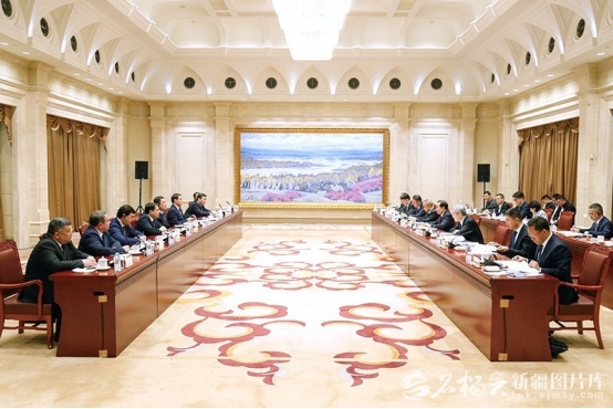 4月6日,自治区党委书记陈小江、自治区主席艾尔肯·吐尼亚孜在乌鲁木齐会见乌兹别克斯坦锡尔河州州长埃尔金容·图尔济莫夫。石榴云/新疆日报记者谢龙摄